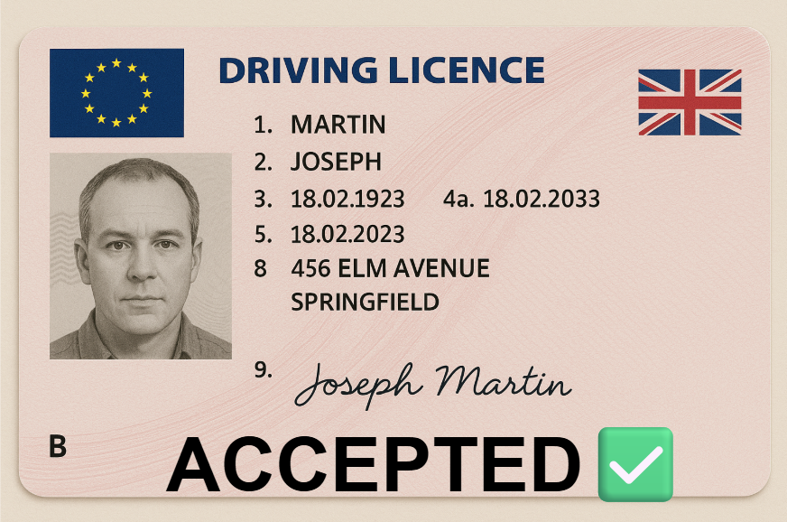 Here are some examples of an approved driving license and a Rejected Driving License: